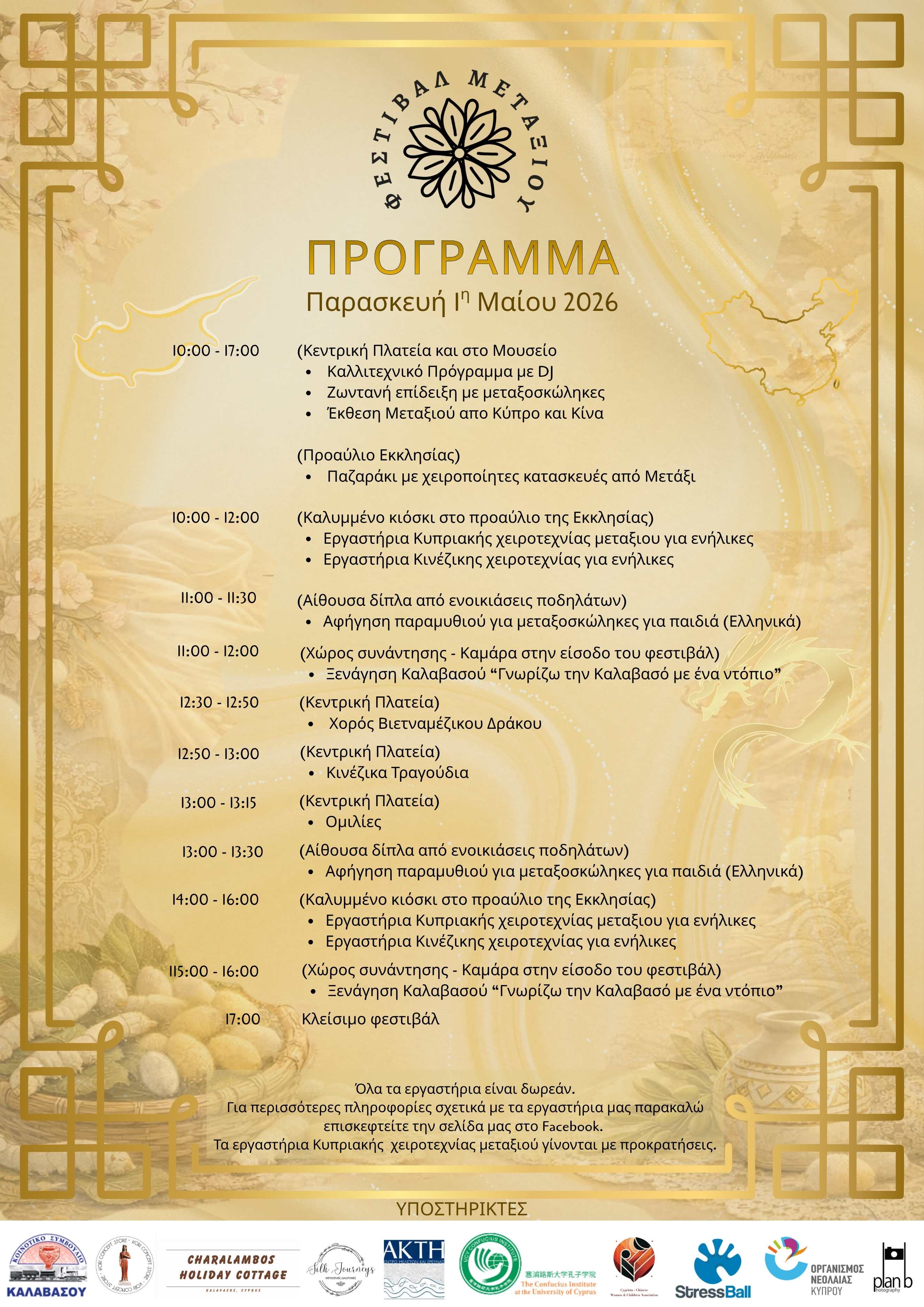 Με τη συμμετοχή της κινεζικής κοινότητας και τη στήριξη του Confucius Institute του Πανεπιστημίου Κύπρου και του Κοινοτικού Συμβουλίου Καλαβασού, το φεστιβάλ προσφέρει μια μοναδική εμπειρία για μικρούς και μεγάλους, γεμάτη γνώση, δημιουργικότητα και πολιτιστική ανταλλαγή.